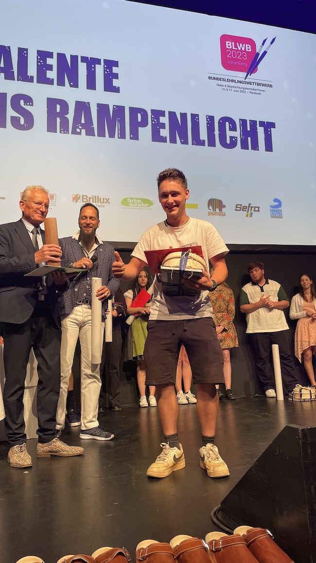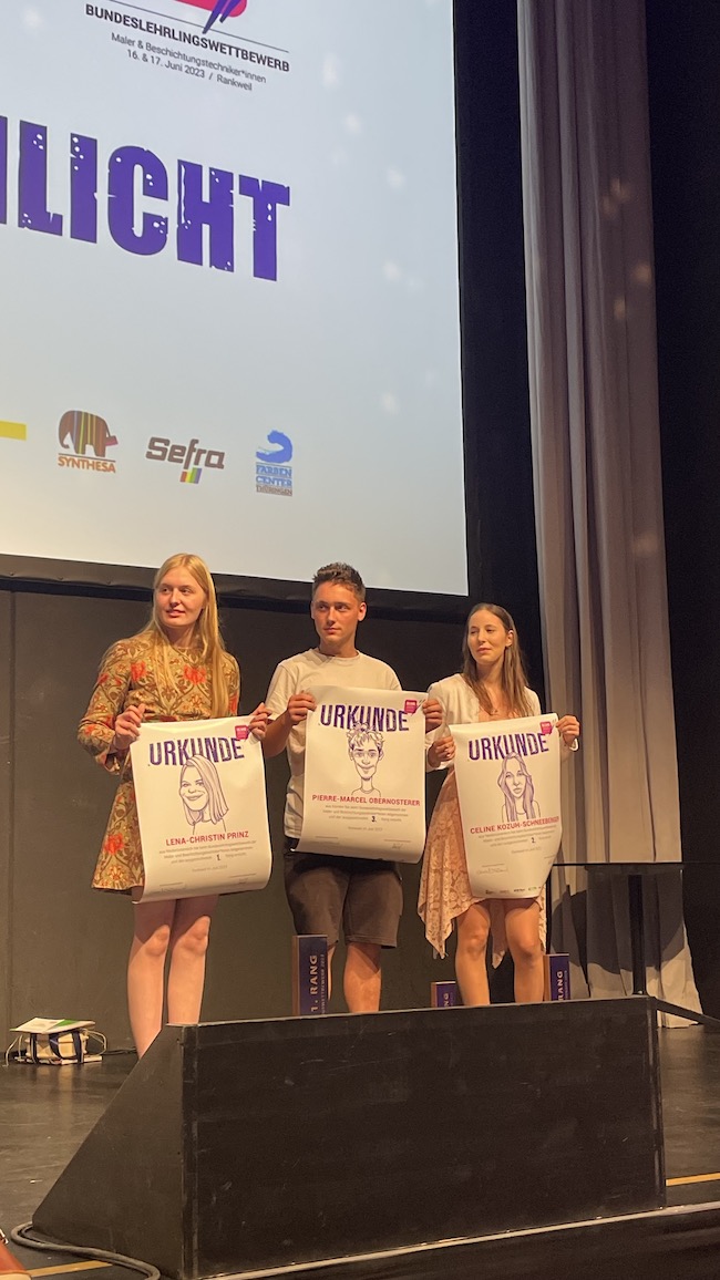 Das harte Training hat sich gelohnt! Pierre Marcel Obernosterer von der Malerei Trapp und Daniela Haiden von der Malerei Bredschneider belegten beim Bundeslehrlingswettbewerb der Maler vom 16. bis 18. Juni 2023 in Vorarlberg die hervorragenden Plätze drei und vier. Nur ein einziger Punkt trennte die beiden Nachwuchstalende im Endklassement. Der Sieg ging an das Bundesland Niederösterreich, deren Jungmaler:innen den ersten und zweiten Platz schafften.